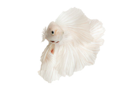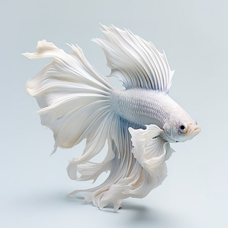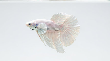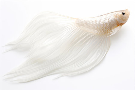 A graceful white Betta fish swims with flowing fins against a pure white background. The image showcases soft textures and delicate lines, highlighting its elegant form. This photograph uses diffused lighting, creating a clean and modern aesthetic suitable for various design projects and commercial applications.