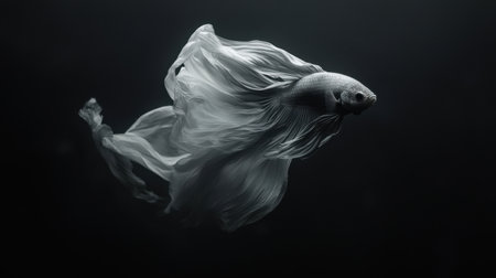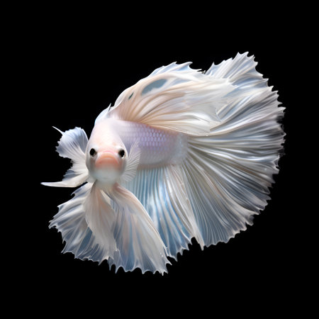 A pristine white betta fish is showcased against a stark black background. The image highlights the fish's intricate fins, displaying a flowing, almost ethereal texture. The lighting accentuates the fish's form, suggesting a clean and modern style, suitable for various editorial and commercial applications. The composition is simple and effective.