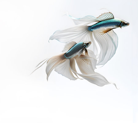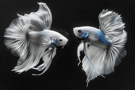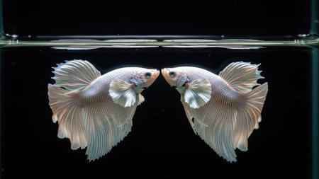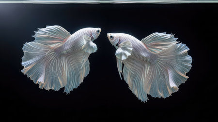 Two elegant Siamese fighting fish are captured in a studio setting, their forms mirrored. They display white and translucent fins against a dark background, highlighted by overhead lighting. The composition suggests a serene aquatic environment, suitable for various editorial and commercial applications. The image offers a clean aesthetic.
