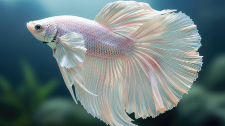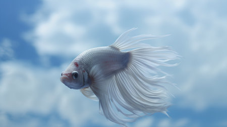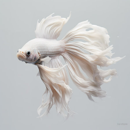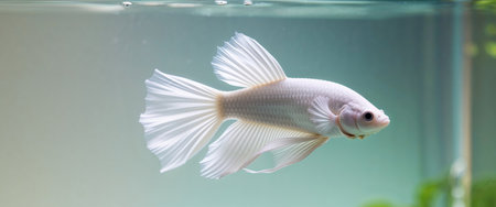 A graceful white Betta fish glides through the water, showcasing its flowing fins. The image features a shallow depth of field, with the fish in sharp focus against a soft, blurred background. The composition highlights the creature's delicate beauty, suitable for various editorial and commercial applications.