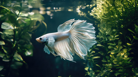 This mesmerizing image captures a stunning white betta fish gliding gracefully through a freshwater aquarium, surrounded by lush greenery.