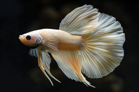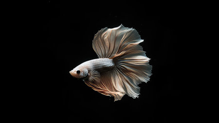 A graceful white Betta fish is showcased against a deep black backdrop. The image highlights the fish's intricate, flowing fins, exhibiting delicate textures and a gradient of soft colors. The lighting emphasizes the form of the subject. Suitable for commercial applications such as design projects and editorial content.