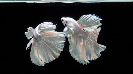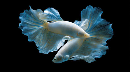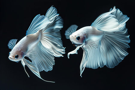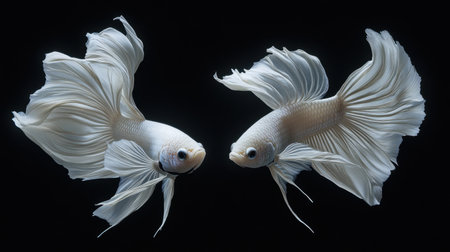 Two elegant Siamese fighting fish are captured in a studio setting against a deep black background. Their pristine white bodies and expansive fins showcase delicate textures, highlighted by soft lighting. This composition offers potential for commercial uses such as aquatic themes or design elements.