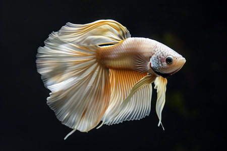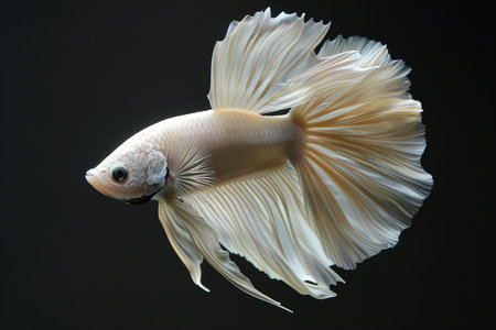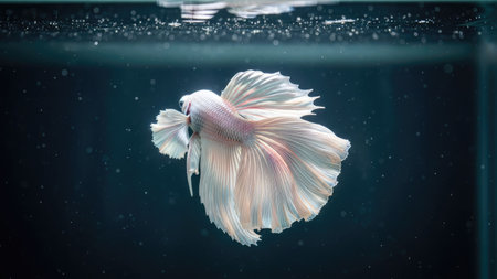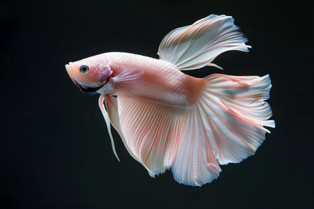 A close-up studio shot showcases a delicate white betta fish, its flowing fins creating a graceful form. The image highlights the fish's iridescent scales and intricate details against a deep, contrasting background. This composition offers potential use for educational content or commercial applications related to aquatic life.