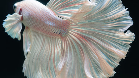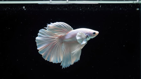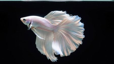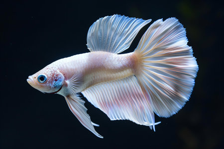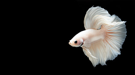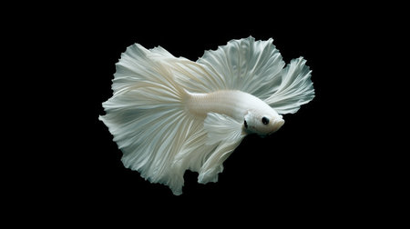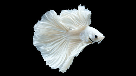 A pristine white betta fish is captured in a graceful pose against a stark black backdrop. Its flowing fins display subtle hues, reflecting a soft light. The image highlights the fish's intricate details and dynamic form. Suitable for various applications, including illustrative and decorative uses.