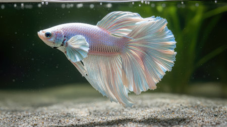 A close-up view presents a Betta fish gracefully suspended in water. The fish exhibits a spectrum of pastel hues, including pink and blue. Its elaborate fins create a flowing appearance against a backdrop of aquatic plants and a sandy bottom. The image may suit various commercial and editorial applications.