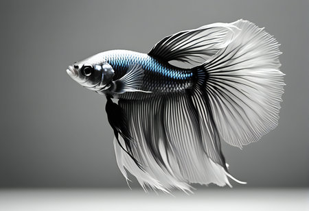 A dynamic image capturing a betta fish in mid-swim, its fins elegantly trailing behind, set against a minimalist background to highlight its beauty