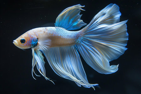 A stunning white Betta fish is displayed against a deep black backdrop. The fish exhibits intricate fin details with shades of white and blue. The composition, lit by soft lighting, highlights the textures and delicate features of the creature, suitable for various editorial and commercial applications.