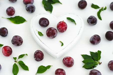 White wooden heart and ripe juicy plums on a white background
