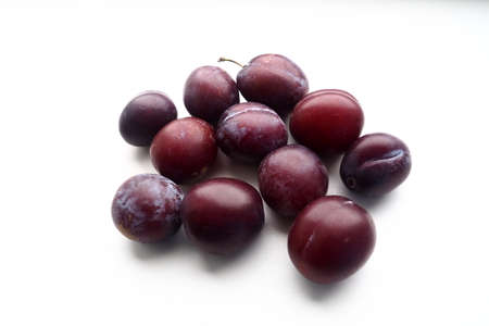 Red plums on white background. Studio shoot.