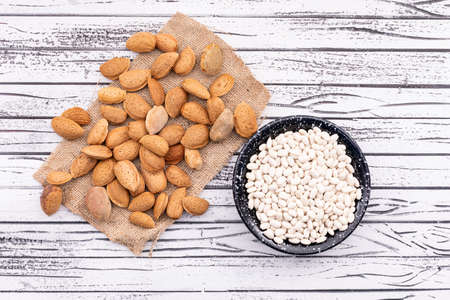 Almonds on sacking on white wooden background