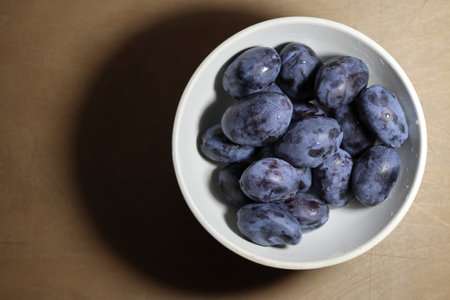 Damson Plum in a bowl. Organic Food Concept.
