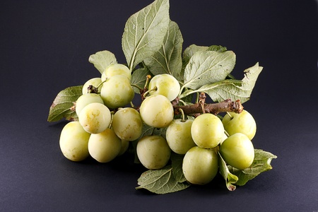 organic green plums on branch isolated on dark background
