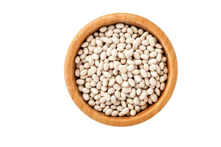 Raw white navy beans in bamboo bowl isolated on white background. Diet for weight loss and fight against cholesterol concept. Top view with copy space.