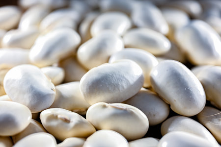 A close-up view of fresh raw white beans, showcasing their smooth texture and neutral color. Perfect for healthy cooking and nutritious recipes.