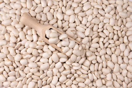 white kidney beans in wooden scoop on background of many grains of dried beans top view, white beans texture, food background close up