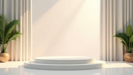 podium display, white background, neutral curtains, and potted green plants, Minimal pedestal for beauty, cosmetic product.