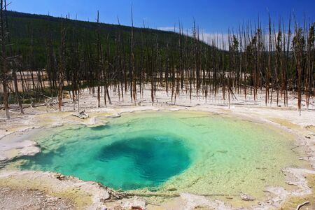 Yellowstone Geyser as seen from above. Pool in the middle of the forest, Wyoming.