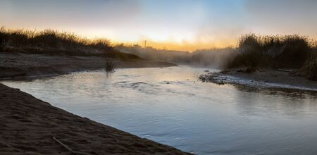 Misty fog follows the water flow of the river estuary among the reeds on the sandy bank.