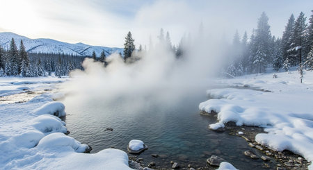 Emerald Spring at Norris Geyser Basin trail area, during winter in Yellowstone National Park, Wyoming, USA