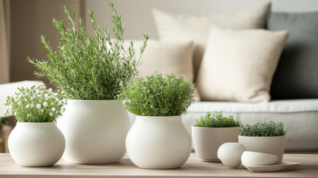 A modern arrangement of green plants in white ceramic vases enhances a stylish living space, complemented by soft pillows and a neutral backdrop.