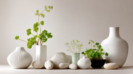 White ceramics and green plants create a simple skincare display on a light surface. Rocks add an organic touch to the spring-inspired arrangement.