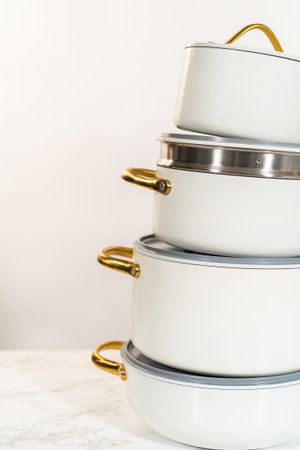 A close-up vertical view of a tiered stack of modern white ceramic pots with golden handles, resting on a marble kitchen counter. Great for catalog images, cookware branding, or kitchen design articles.