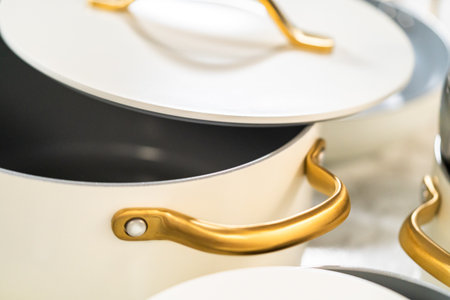 Top-down view of a pot with gold handle and open lid. Ideal for cookware promotions or product advertisements.