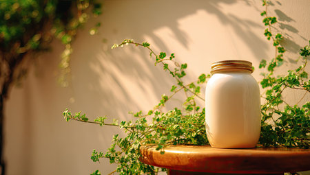 Cream-colored jar with a gold lid sits on a wooden table amongst lush green plants. Natural light casts gentle shadows on the surface. The image emphasizes the peaceful and natural aesthetic.