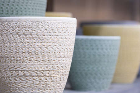 Empty garden pots in a row close up