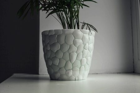 Flower pot on white table with copy space. Minimal style.