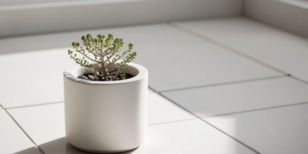AI Generated. A small plant sits in a white pot on a tiled floor
