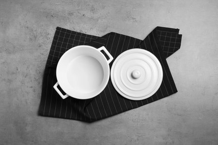 One empty ceramic pot and lid on gray textured table, top view