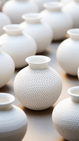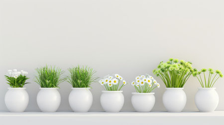 Neat row of white flower pots with small plants, modern minimalist arrangement under soft light
