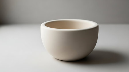 A minimalist, white ceramic bowl with a smooth, rounded design sits on a plain surface. The bowl is empty and appears to be handcrafted, showcasing a clean and elegant aesthetic. The lighting casts a subtle shadow, highlighting the bowl's smooth texture and curves.