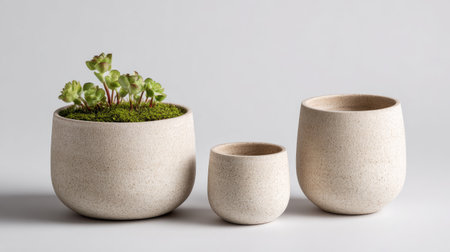 A set of three stylish planters with succulent plants adds an elegant touch to any space. The minimalist design in neutral tones enhances warmth and tranquility.