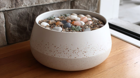 This image showcases an elegant bowl filled with various succulents and colorful stones, set on a wooden surface against a stone wall, ideal for modern home decor.