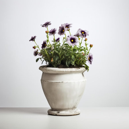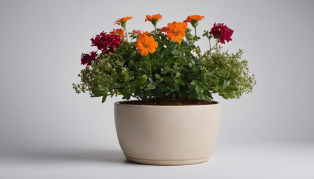 the flowerpot, adorned with vibrant greenery, sits elegantly against a pristine white background, showcasing its earthy charm and adding a touch of natural beauty to any indoor space, perfect for home decor and gardening enthusiasts alike. ai generated