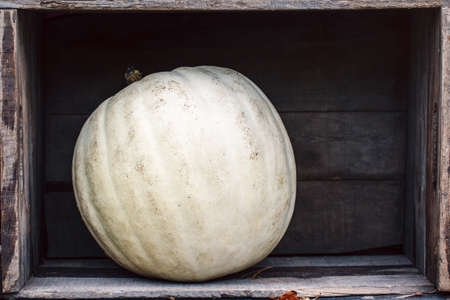 Fresh harvest, one farm white round pumpkin with unusual funny curvy shape form on wooden shelf furniture box, with copy space for text
