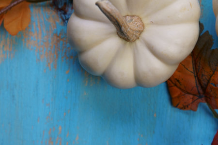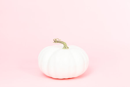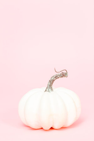 Flat lay of mini decorative white pumpkin on bright background from above at the left. Halloween and Thanksgiving greeting card holiday concept with copy space