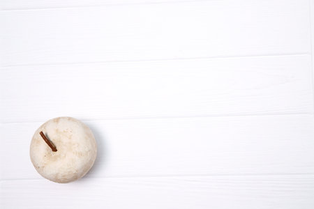Home decoration, ceramic apple shape decor on wooden background, copy space