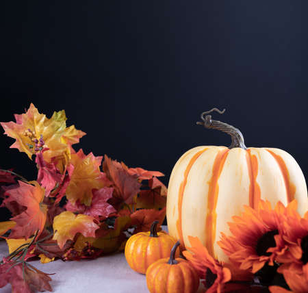 Happy Thanksgiving Day, black background decorated with Pumpkins and autumn leaf Copy space.