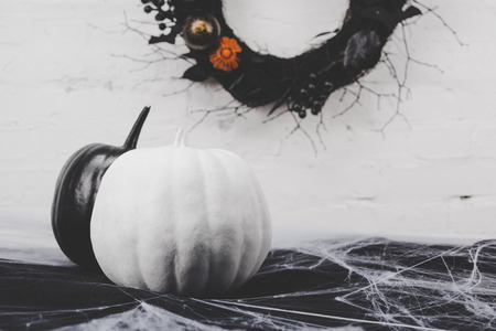 Black and white pumpkins on dark background. Halloween banner for party ad or shopping sales. 3D illustration. Copy space.