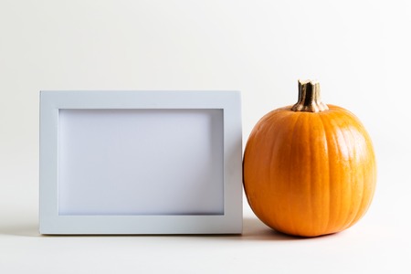 Mock up flat lay of mini decorative pumpkin white, orange and yellow colors and white frame on bright background. Halloween and Thanksgiving greeting card holiday concept with copy space