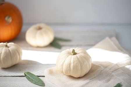 White Pumpkins in the festive season of Fall or Autumn on wooden background.