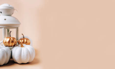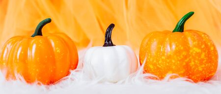 Banner of mini decorative white pumpkins on the left on orange background with copy space. Halloween and Thanksgiving greeting card holiday concept