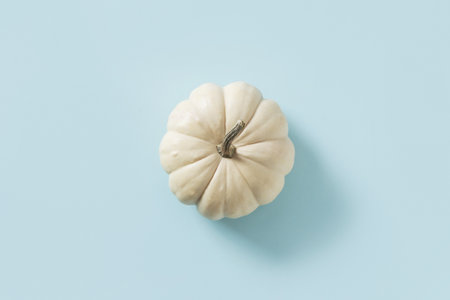 Autumn white pumpkin on blue background. Seasonal food. Top view. Thanksgiving Day. Minimal flat lay style.