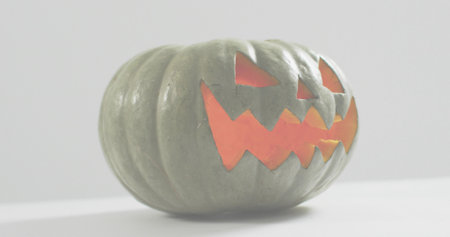 Glowing jack-o'-lantern on white tabletop casting orange light, soft reflection and shadow. Pumpkin, carved, ribbed, centered, studio, highkey, minimal