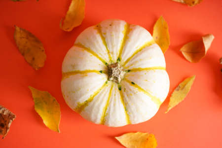 White pumpkin on orange background. Autumn banner with pumpkin. Recipe banner for seasonal cooking class. Thanksgiving wallpaper background. Harvest festival. High quality photo
