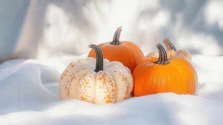 Full frame close up view of large ripe white Jack O' Lantern size pumpkins with defocused outdoor background and copy space